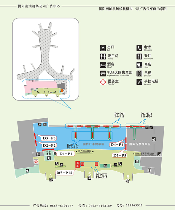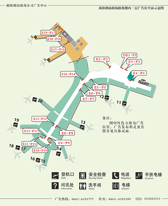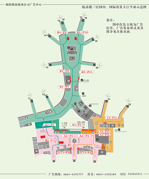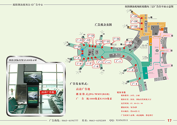 揭陽(yáng)潮汕機(jī)場(chǎng)廣告中心獨(dú)家擁有揭陽(yáng)潮汕機(jī)場(chǎng)所屬媒體的廣告資源經(jīng)營(yíng)權(quán),目前主要媒體類型有燈箱廣告、LED、T柱、平面廣告、看板、實(shí)物展臺(tái)、廣告機(jī)等。